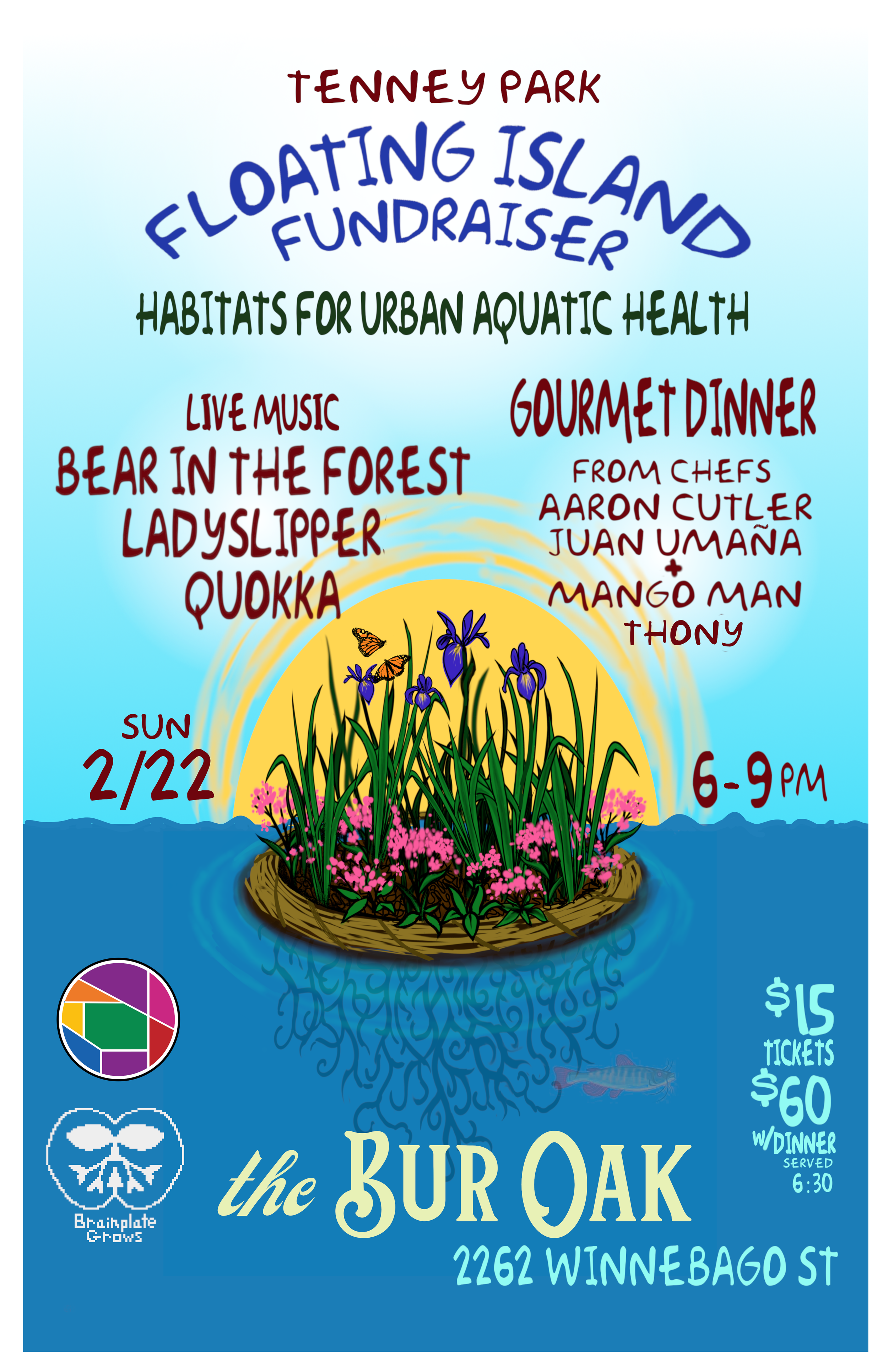 Help us bring a floating island to Tenney Park lagoon this spring by attending dinner and a show. Our Floating Island Fundraiser and Silent Auction will feature music by Bear in the Forest, Ladyslippers, and Quokka. A highlight of the evening will be a unique gourmet meal by chefs Juan Umana of Vengan Pa’ka, Aaron Cutler, and Mango Man Thony Clarke.